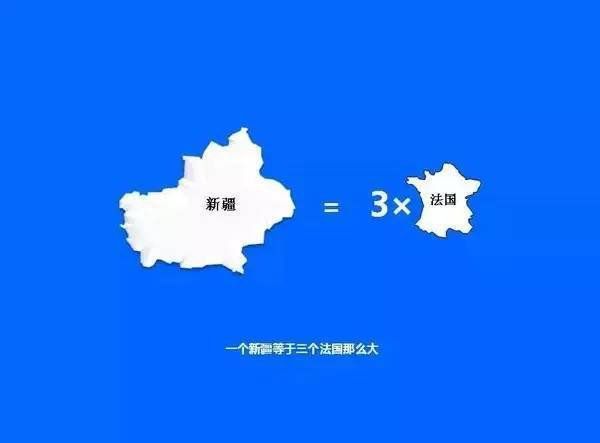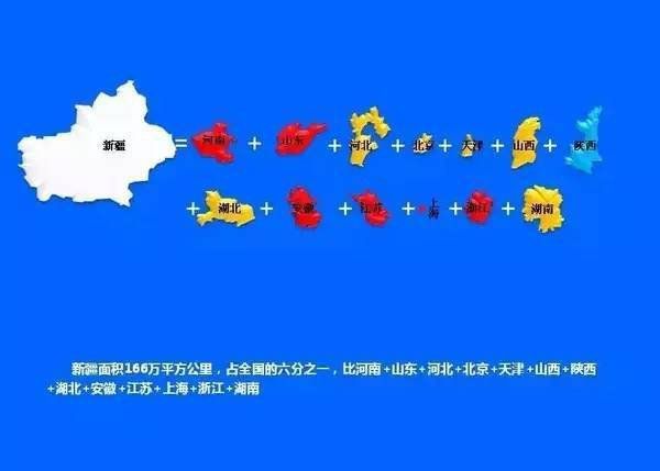 1.新疆面积 166 万平方公里,占全国的六分之一,比河南 + 山东 + 河北 + 北京 + 天津 + 山西 + 陕西 + 湖北 + 安徽 + 江苏 + 上海 + 浙江 + 湖南这13 个省市加一起还要大一点。