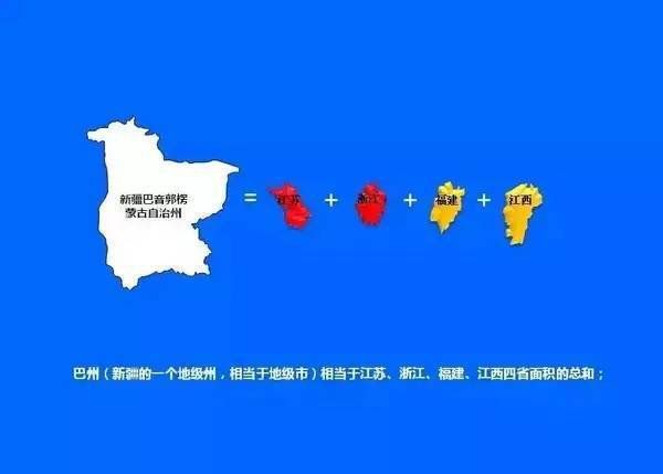 2.巴州(新疆的一个地级州,相当于地级市)相当于江苏、浙江、福建、江西四省面积的总和;