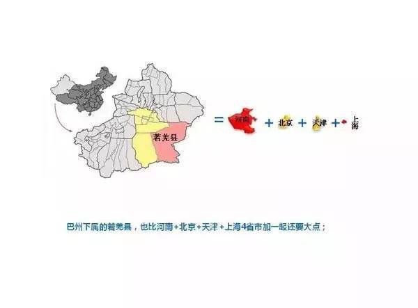 3.就连巴州下属的若羌县,也比河南 + 北京 + 天津 + 上海 4 省市加一起还要大点;