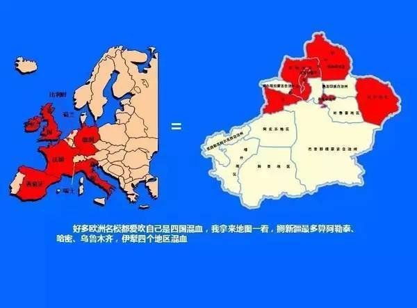 10.好多欧洲名模都爱吹自己是四国混血,我拿来地图一看,搁新疆最多算阿勒泰、哈密、乌鲁木齐,伊犁四个地区混血;