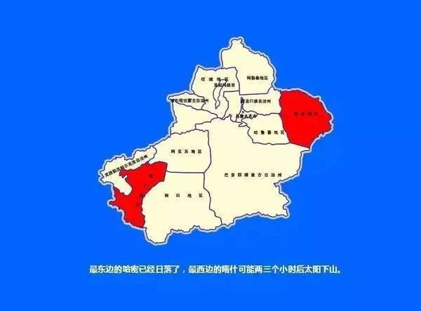 16.最东边的哈密已经日落了,最西边的喀什可能两三个小时后太阳下山 ;