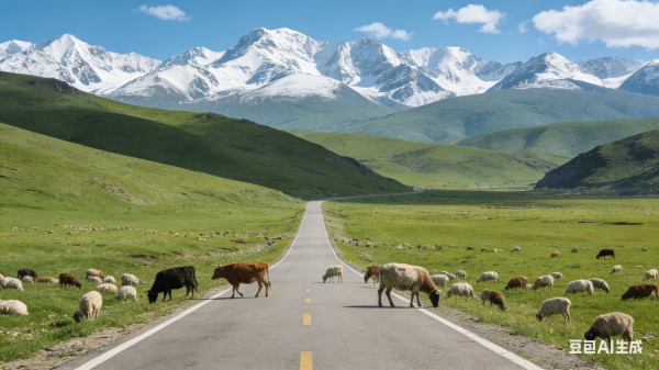 独库公路中段那拉提草原段,草原绿草如茵,牛羊成群,公路穿行其间,远处是连绵的雪山。