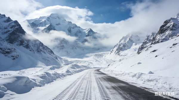 独库公路哈希勒根达坂段,展示雪山冰川景观,公路被积雪覆盖,两旁是高耸的雪山,云雾缭绕。