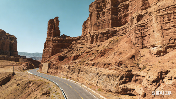 独库公路终点库车段,展示红山石林地貌,红色的山体陡峭险峻,公路在峡谷中穿行,岩壁纹理清晰。