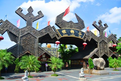 海南槟榔谷黎苗文化旅游区创建于1998年,地处北纬18°,位于保亭县与三亚市交界的甘什岭自然保护区境内。景区坐落在万余棵亭亭玉立、婀娜多姿的槟榔林海,并置身于古木参天、藤蔓交织的热带雨林中,规划面积5000余亩,距亚龙湾海岸26公里,距三亚市中心28公里。槟榔谷因其两边森林层峦叠嶂,中间是一条延绵数